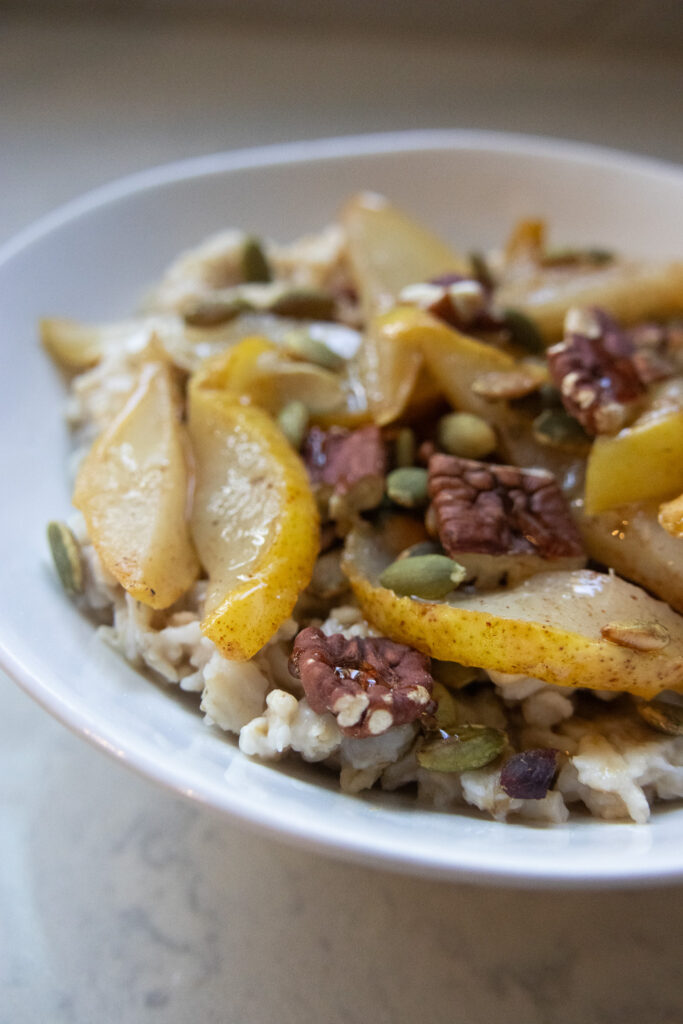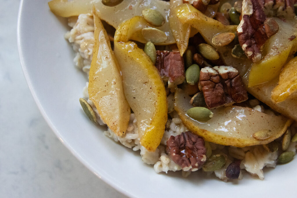 - Spoon the oatmeal into bowls, top with the roasted pears, sprinkle with toasted pecans and pumpkin seeds, and finish with a drizzle of maple syrup or a splash of milk.