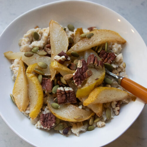 I love making this oatmeal on those gray, misty mornings when the air feels heavy with fall. The pears caramelize in the oven, their sweetness deepening as they roast with cinnamon and cardamom. Meanwhile, the pecans and pumpkin seeds toast in a skillet, filling the kitchen with their nutty aroma.